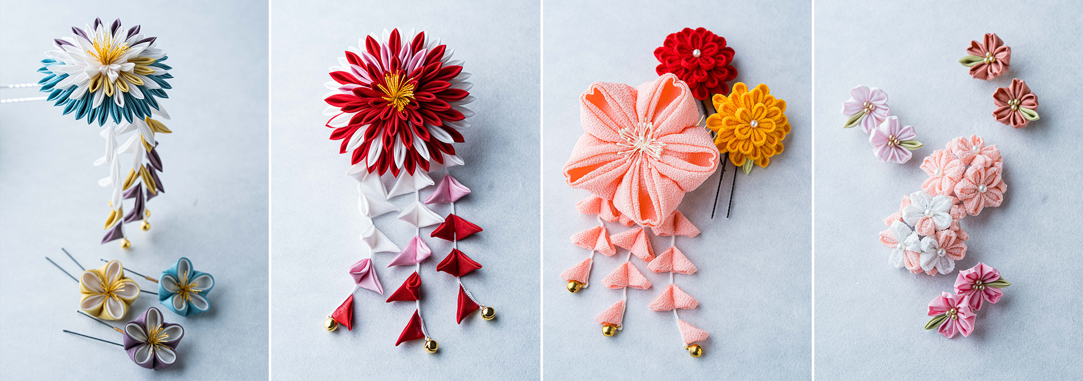 つまみかんざしの起源は、江戸時代初期に京都で花びらをモチーフにした簪(かんざし)が作られ、それが江戸に伝わり、より簡素な「つまみかんざし」が誕生したといわれています。江戸時代中期以降には、武家や町人の間でも着物の端切れなどを使って作ることが流行し、参勤交代のお土産としても重宝されたと伝えられています。そこには、美しい花を髪にまとう、日本人ならではの美意識と、余った布も無駄にしない、日本人のモノを大切にする心が今もしっかり息づいています。「日本らしい縁起物も多いんです。たとえば桜には五穀豊穣や繁栄の意味がある。身につけることで、お守りにもなるんですよ」と藤井さん。
