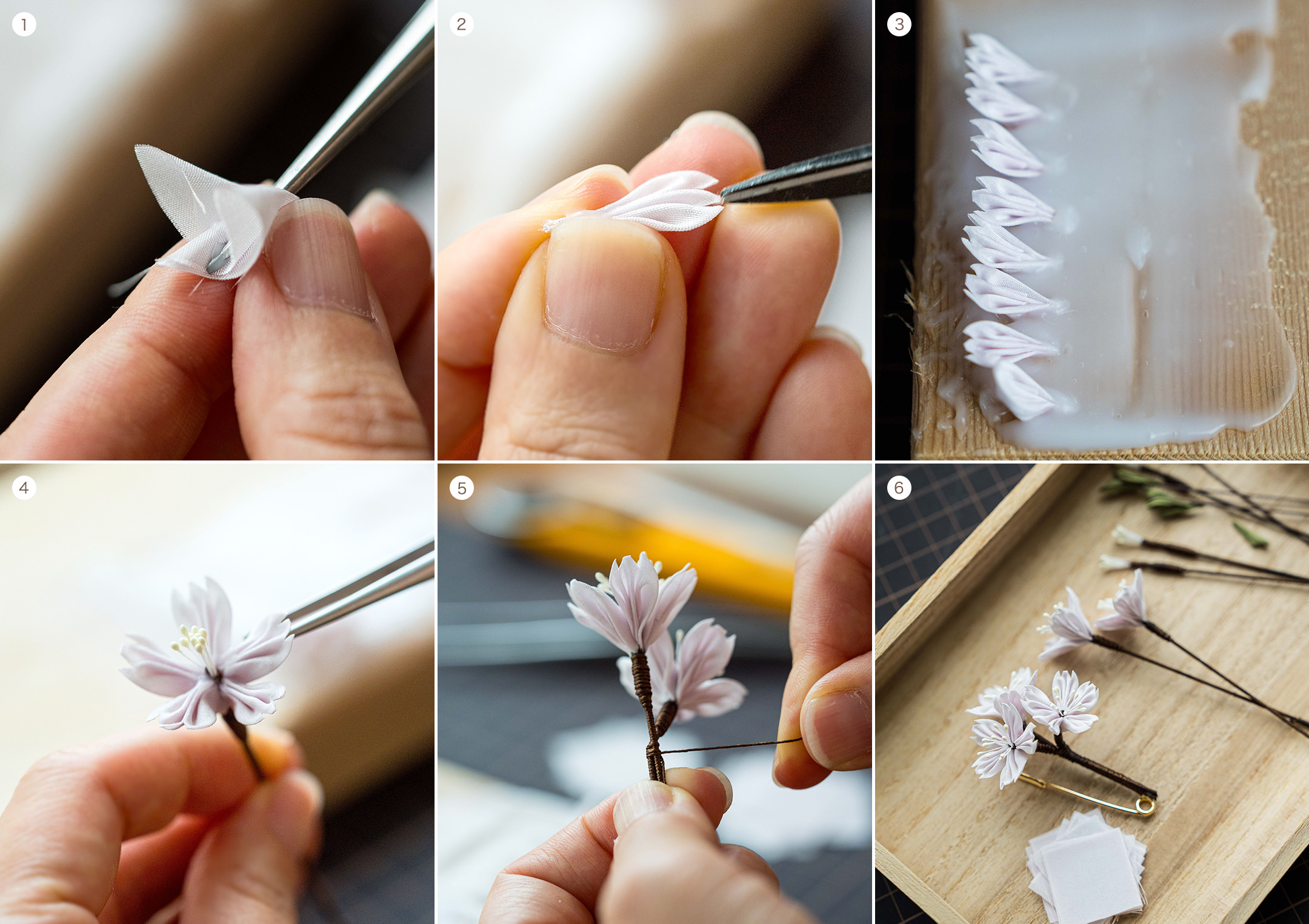 体験教室をやっていたので、早速参加させていただいたところ、小さな正方形の布をピンセットを使って折りたたみ、いくつも花びらを作って、花に仕立てていく。これなら、大きな道具がいらないから、海外に行ったときにもデモンストレーションしやすいかなと思いました。ただ、このときはまだ“手当たり次第”の一環。趣味の領域でした。